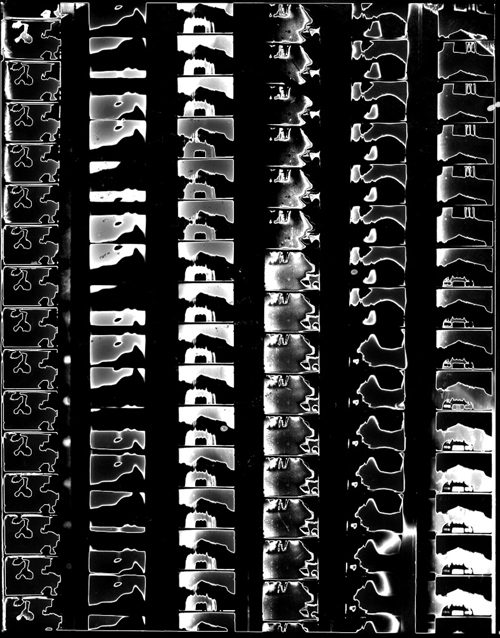 Beginning with a “realistic” image, either originally made by me, or pulled from compilation footage, I take either the form of the original image, the movement, or the emotional quality as the impetus for selection. I take apart (deconstruct) the realism inherent in the image. This leaves me with an abstraction of form and movement, and I leave the emotional quality of the image intact. I then create a pulsing loop, which seems appropriate for the image in question, and as it fits into the scheme of the whole film. A shot may undergo as many as seven or eight transformations before it is ready to be used. There is beauty in this elongated process. Essentially, every stage becomes a new shot within itself, and can therefore be incorporated into a film structure: one can cut from reversal to negative and through this create the continuity needed for the film to be coherent.