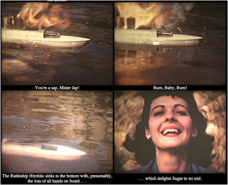 Archery Antics is nearly as mysterious as the Auroratone itself. Yet, Robert’s mention of the two films’ provenance connection revealed a common thread between the Auroratone and “psychodramatic” films shown to psychiatric patients during World War II. Made by the sponsored film producer Don Robert Catlin, the nine-minute Archery Antics opens with (as the narration describes) “a shady lagoon, a swing, a beautiful girl, and a roving archer,” played by the world-famous archer Ande Vail. After Vail bullseyes a red balloon attached to the buxom female’s toe, the couple engages in a host of exhilarating acts: target practice, match-lighting, and feasting on an elaborate spread of picnic food. “I’ll bet they don’t feed you this good in the army,” the narrator speculates. The film ends – insanely – with an alarming periscopic close-up of a toy battleship floating in a nearby pond, emblazoned with the Japanese flag and the name “Hirohito.” In a drawn-out tension-filled finale, Vail shoots an arrow sinking the boat in a fiery flurry, while Rossini’s thundering “William Tell Overture” climaxes on the soundtrack.