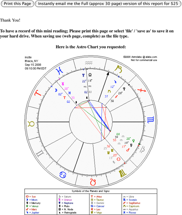 Incite’s natal horoscope has been calculated according to the time of incite-online’s original launch (its “birth time”). The planets, seven Chaldean and three Transaturnian, are marked on the arc of a circle as they appeared when I first uploaded incite’s /index folder to our server using an a typical file transfer protocol. We read the chart as an articulation of incite’s birth into the world, and the subsequent life of this journal within the 365 day calendar and its derivative units; months, weeks, days, hours, minutes. The journal’s Rising Sign, the left-most point on the circle’s arc and also the “who I am” of the natal chart, is on the fourteenth degree of Taurus (♉), a degree for which American Astrologer Marc Edmund Jones associated the following image: “Several children are splashing with delight in a receding tide, and at their feet are shellfish groping for shelter.” If incite is a gaggle of small children at the whim of tidal flux, then the journal must also be the shellfish underneath, trampled and seeking refuge in the water’s salty depths. The Sun degree, 23 Virgo (♍), suggests a cautious nature, and careful attention to details. Atop the chart, the northernmost point or North Node (☊) is a navigational beacon towards which everything within the chart eventually moves. Incite’s Node is on the eighteenth degree of Aquarius and the associated Sabian Symbol (via Jones) is: “The masquerade has long been in progress and laughing young ladies at last have forced the final male to unmask.” The Kozminsky Symbol, an alternative image associated with this degree, is “A lion running down a dreary and barren field at the end of which is a V-shaped road. On the one side are hunters armed, on the other a rocky entrance leads to sunlit lawns.”