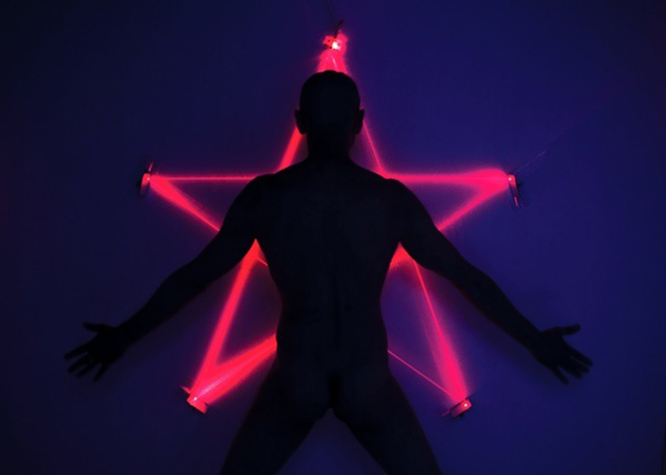 My father returns to the box in the center of the room, with the paintings now only a memory, concealed under layers of white paint. Carefully arranged inside the box are small mirrors on hinges, as well as lasers, screws and a screwdriver in place of his brush. He removes the contents and attaches the mirrors to each wall. He then returns to the box and trades his screwdriver for a bundle of sage, which he uses to bless the first wall by lighting the herb aflame. Cut to a rapid flash of fiery images; the light in the room has diminished and the laser has been turned on, reflecting in the mathematical arrangement of mirrors to create a blazing red pentagram. The organic nature of the previous sequence now transitions to a technological reunification of the destroyed art.