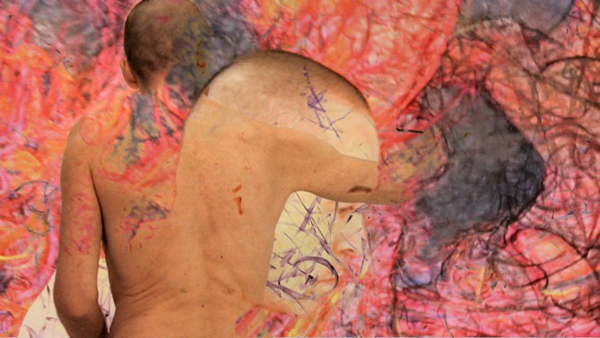 Our previous collaboration, Drawing Genesis (2006),1 was photographed in a freeform, improvised style; documenting my father’s ritualistic painting process. Rather than focusing on the creation of actual paintings, the film centers more on my father fiddling with props, costumes, mirrors and dance, and fussing with uncompleted paintings, while I obstructed the lens with various translucent objects, crystal spheres and Vaseline in a frenzied, in-camera montage of his work, occult symbols, performative gesture and visual vestiges. Later, I came to understand that this ritual was part of his madness in finding inspiration in chaos: he employs ritualized physical movement, dance, controlled breathing, physical exertion and music to achieve a trance-like state, in which the canvas serves as a record for the paint and ink that happen to be transferred in this process. He then makes use of the forms, lines and shapes that have appeared to the mind’s eye as suggested by his incoherent scribble and reflection of light on the canvas, which serve as the groundwork for drawing out recognizable imagery, until the composition manifests as a writhing dream-architecture of nude forms.