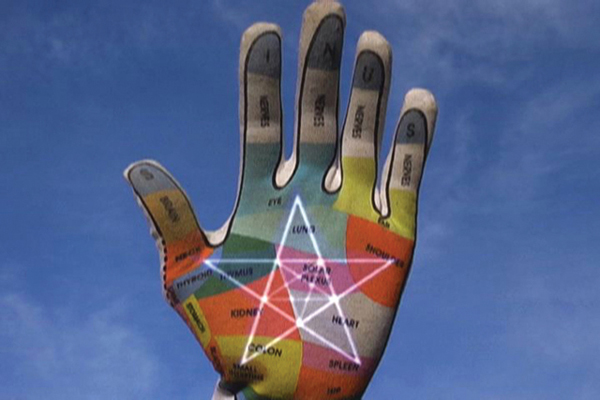 Similarly plumbed in Whispering Pines are the depths of New Ageism’s signs, symbols, and patterns. Cynthia, suffering as usual from some malady of living, visits Healing Hands near the Sierra National Forest, and what she finds is a triumph of mise-en-scène. Innumerable sculptural permutations of a single hand, palm held upward, are on view—an open-palmed hand chair, hand chandelier, hand-shaped lotion bottle. The room Moulton has fashioned serves as a kind of perverse hieroglyph. Whereas occult traditions of knowledge, stemming from medieval conflations of science and magic, were based upon purportedly ancient, precise, and exacting semiotic systems (systems, it’s worth noting, that would be creatively deployed by artists and filmmakers like Kenneth Anger, Harry Smith, and Derek Jarman, among others), New Age practices hold a more tenuous link to the past. A philosophical pastiche, its pervasive themes are often severed from history, and so Moulton’s construction presents a formal situation that suggests itself as translatable, yet whose ultimate meaning is fascinatingly unmoored.