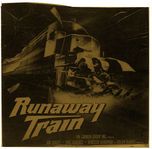 JB: It lost its currency; I think it’s still legible through a reading of history or a historical period, but it was right on the cusp then. Trains have a particular relationship to cinema and also to perspective. I thought about them in relation to perspective – barreling along a perspectival cone from the past to the present. In the mid-80s, you still had to “catch” a movie – it was before VCRs were common. The advertisement said: “Runaway Train. Coming soon. Catch it at a theater near you!” I followed its trajectory, which is a bit of a pun, but that’s what happened. First I cut out the ad from the New York Times. Then, I photographed the title on the marquee. The last part was going to see the movie. The train moves forward relentlessly, parallel to the narrative trajectory of the movie. You catch the train (and the movie) and ride it all the way through.