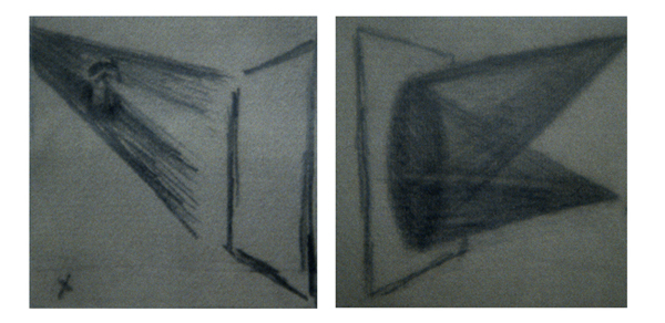 Jennifer Bolande: I saw a short documentary made by NASA called Planet Mars (c. 1979), at an exhibition on space photography. During the screening I took photos of the film from my seat. I’ve done that with a number of works. Whether it’s the end titles or opening credits, the main point of interest for me is often something peripheral to the body of the film. In this case, one of the things that appealed to me was how the beam of the projector focused on a circle (Mars), which filled the screen, forming a big, beautiful cone of orange light. I was very aware of my position in relationship to that cone, which my perceptual cone was intersecting with. The drawing Vision Cones Diagram illustrates this cinematic experience.
